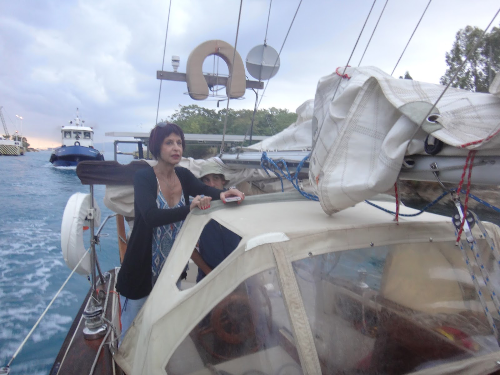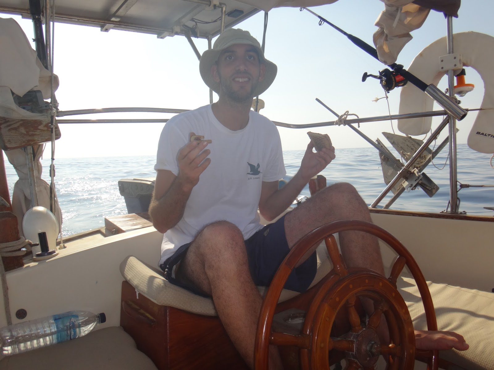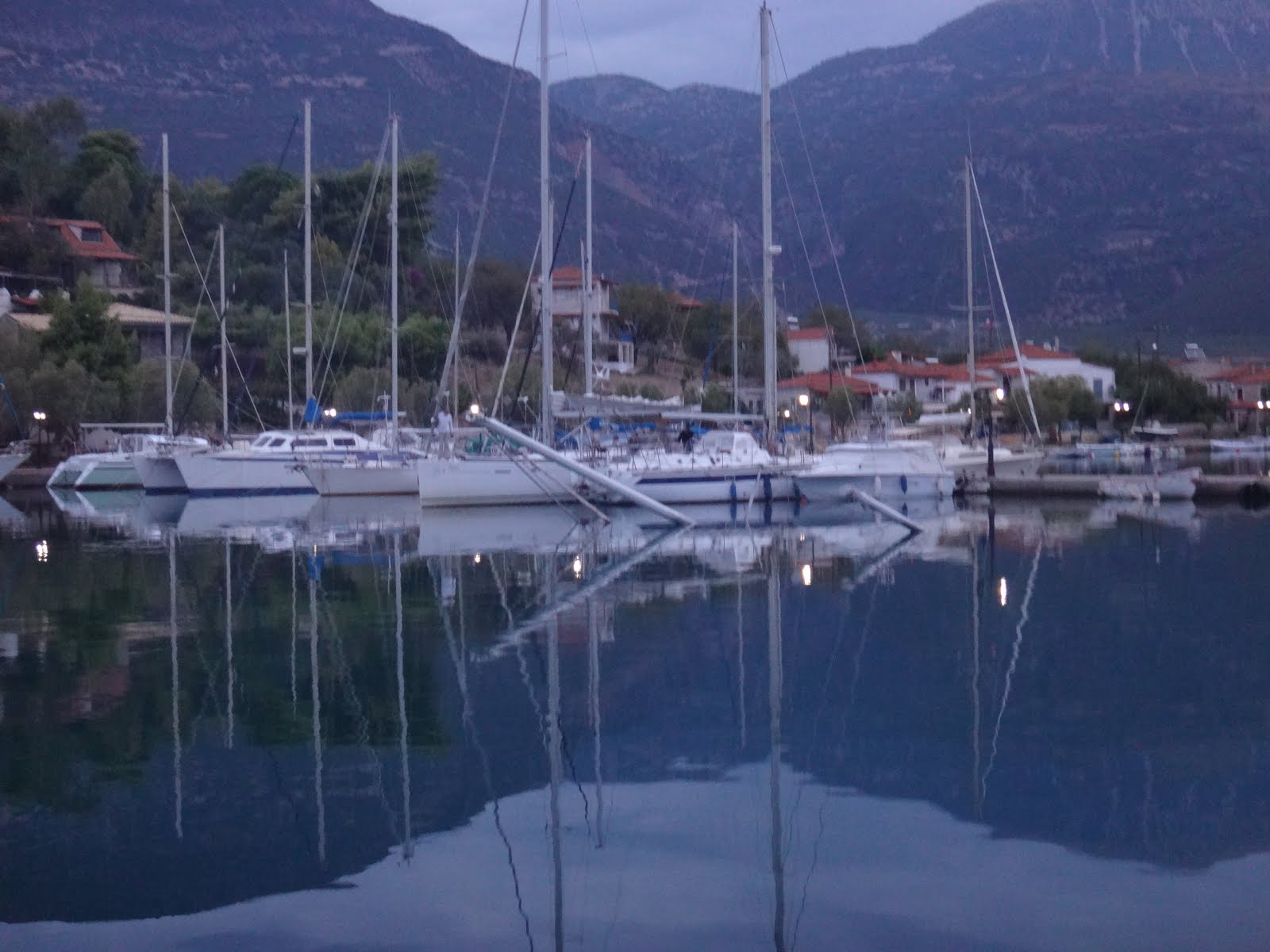 הים היה חלק והרוח גבית, כך שההפלגה היתה נוחה. רק עננים רחוקים הזכירו את הסערה של היום הקודם. בשעת צהריים מוקדמת ולא אופיינית לנו הגענו אל האי. טריזוניה הוא אי קטן וחמוד שנמצא קרוב מאוד לחוף ובו מתגוררים כ60 תושבים. יש בו מספר מלונות ומסעדות. המרינה שלו מרווחת אך גם לא גמורה, כלומר יש בורות ברציפים ואין שירותים מסודרים (אין גם דמי עגינה). בעודנו עושים סיבוב דאווין והתרשמות ומחפשים מקום עגינה במרינה המלאה למדי, שמנו לב לתורן שצץ לו ובולט מהמים החוצה. מבט קרוב יותר וסיבוב מהיר של ההגה הראו שמדובר במפרשית די גדולה שטבעה לפני 10 שנים ועדיין נשארה במקום שלה ליד הרציף. נקשרנו בעזרת שכנים וריפדנו היטב את הצד בגלל פיגומי הברזל שבלטו. במרינה יש סירות מכל מני סוגים, על חלקן הבעלים גרים ומעבירים את החורף, וחלקן סירות רפאים שננטשו או נשכחו מה שיצר אווירה קצת מוזרה. קפצנו לנשנש משהו וחיכנו ללירון אחותי שמצטרפת כאן למסע ובאותם רגעים היתה בדרכה אלינו באמצעות שלל אמצעי תחבורה יווניים (כולל זרים נחמדים). בתאום מושלם לירון ירדה מה -boat taxi שהביא אותה מהחוף ישר לארוחה במסעדה היחידה שהיתה פתוחה.