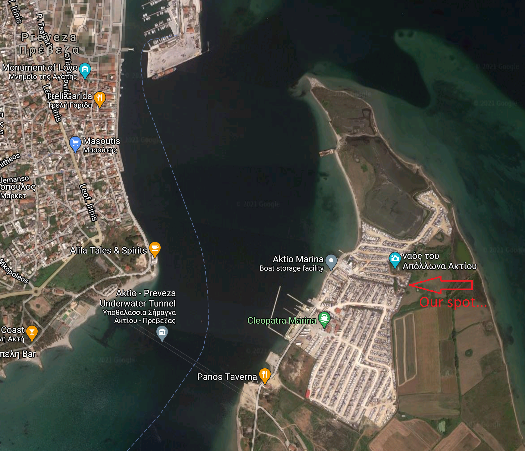 כמה מילים על המספנה: באיזור פרווזה ישנן שלוש מספנות מרכזיות שמשמשות לאחסנה ארוכה של סירות (בדרך כלל לתקופת החורף), ועוד בטרם הנסיעה בדקתי את האפשרויות והמחירים. המספנות מתמלאות ולכן יש צורך בשריון מקום מראש, ובסוף בחרתי באקטיו, שהמחירים בה סבירים וכן ניתן לעבוד בה על הסירה בעצמך (ולא דרך בעל מקצוע של המרינה), מה שהיווה יתרון משמעותי מבחינתי.
